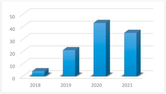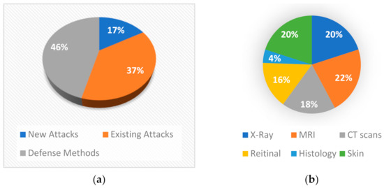 In this section, a statistical analysis of the literature is presented for identifying the current trends the research community is focused on. The analysis is based on the outcomes of provided by the search mentioned in the previous section using the app dimensions tool. As we can see from Figure 3, the first studies were presented in 2018, which means that until 2021 there are few works on this domain (103 in total). Most of these papers aim to prove that adversarial attacks affect medical images using existing attacks, while some studies propose new attacks for medical images or try to defend against these attacks (Figure 4a). From Figure 4a we can understand that so far researchers have focused on whether adversarial attacks can affect the models’ effectiveness. This is reasonable because the research area of adversarial attacks is new. However, more studies on defense methods will be expected in the next years. First papers tried to implement known attacks such as FGSM, PGD, etc. in order to test medical images under general attacks. Results have shown that these attacks are quite effective on all modalities but also, they are easily detected. Later, researchers tried to create custom attacks for medical images. Most of these attacks exploit features from several modalities. Two studies simulate the phenomenon of bias field which occur on medical images [25,26] to attack the models while others take advantage of noise that high tech medical imaging systems create. On the other hand, some studies tried to deploy these features in order to build more robust models. Mainly, adversarial training was the most used defense method, but it is not very robust under unknown attacks. Ensemble training is another method that is implemented as a defense method. However, there are studies that develop their own way to detect or defend against attacks which is more sophisticated.