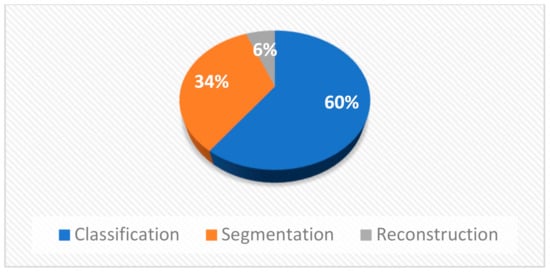 Furthermore, in Figure 4b it appears that most researchers experimented with MRI, X-rays, and dermoscopy images as they are the most frequently used because most medical free datasets contain these modalities. Moreover, CT-scans and fundoscopy were widely examined while histopathological and microscopy images were tested by only one paper. Also, as it is shown in Figure 5 the studies are mainly focusing on classification tasks and secondarily on segmentation tasks. In addition, only three studies are dealing with reconstruction tasks.