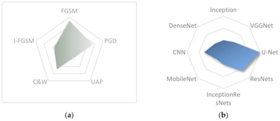 Moreover, most studies used pre-trained models for experiments as shown in Figure 6b. Transfer Learning has boosted deep learning as we can train easily very big models and that is why this method is widely used in medical image analysis. However, these models are designed for natural images, which are more complicated and therefore require more parameters. However, the models for medical images, need fewer parameters and according to Ma et al. [21], the overparameterization of these models could be an important reason for the significant reduction in accuracy. U-Net was the most used model for segmentation task as it is the state-of-the-art on this domain while ResNets was widely used for the task of classification. Experiments with custom models that are designed for medical applications, may help us to draw more safe conclusions. From the pre-trained models, DenseNets seem to be the most robust and as a consequence, the dense blocks enhance the model’s safety. Furthermore, gradient-based attacks are the most efficient—such as FGSM, PGD, I-FGSM, etc.—and that is why they are often used as shown in Figure 6a. Also, most of new attacks compared with these.