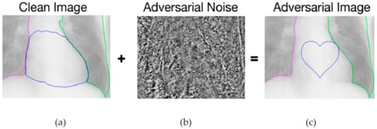 - Bortsova, G.; Dubost, F.; Hogeweg, L.; Katramados, I.; de Bruijne, M. Adversarial Heart Attack: Neural Networks Fooled to Segment Heart Symbols in Chest X-Ray Images. arXiv 2021, arXiv:2104.00139. Available online: http://arxiv.org/abs/2104.00139 (accessed on 10 August 2021).
