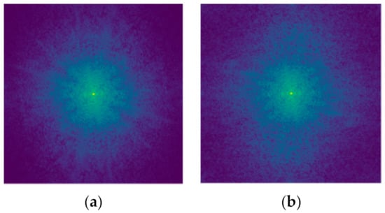 The (a) image is the frequency domain of a clean image and the (b) is the frequency domain of an adversarial image.