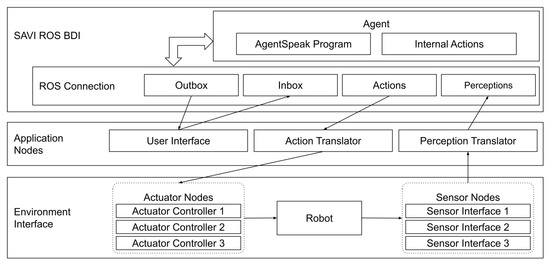 The final example is the concept of “Abstraction Engines”, which provides the means for a robot’s continuous sensors and actuators to be abstracted from the agent so that it does not get overwhelmed with sensor data [44,45]. This approach has been demonstrated using both the GWENDOLEN and Jason BDI reasoners, and has been demonstrated with a number of robot platforms with various sensors, both with and without the use of ROS. The main focus of this approach was how the sensors and actuators should be abstracted from the agent so that the reasoner does not get bogged down by continuous sensor data. Although this provided a significant strength to the approach, there was very little discussion of how the agent’s behaviour should be designed.