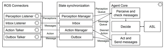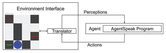 - Wesz, R. Integrating Robot Control Into The AgentSpeak(L) Programming Language. Master’s Thesis, Pontifical Catholic University of Rio Grande do Sul, Porto Alegre, Brazil, 2015. Available online: http://repositorio.pucrs.br/dspace/bitstream/10923/9007/1/000480471-Texto%2BCompleto-0.pdf (accessed on 1 September 2021).