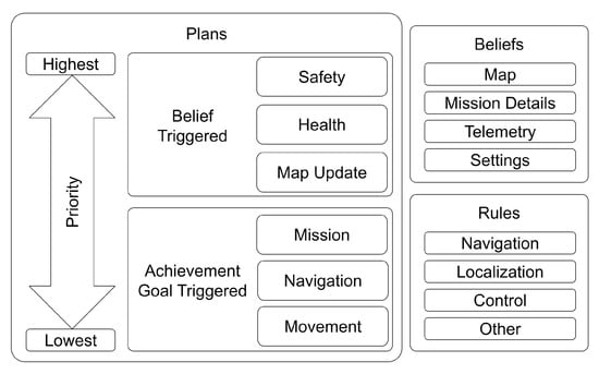 - Gavigan, P.; Esfandiari, B. BDI for Autonomous Mobile Robot Navigation. In Proceedings of the 9th International Workshop on Engineering Multi-Agent Systems, London, UK, 3–4 May 2021. [Google Scholar]