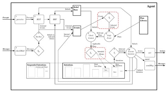 BDI Reasoning Cycle in Jason with Event and Option Selection Highlighted [1].
