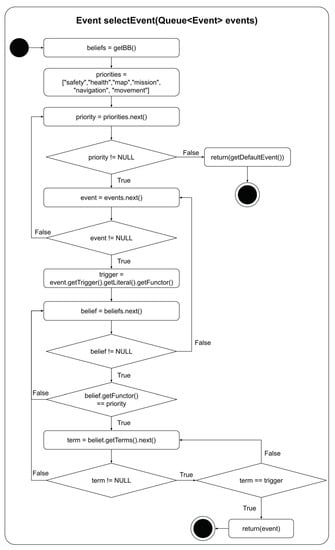 Now that the agent has knowledge of the types of behaviour each event can trigger, the reasoner’s event selection function can use these beliefs for selecting the highest priority triggering event for the agent’s current circumstance. The implementation of this prioritisation is illustrated in Figure 5. This function is called by the Jason reasoner to select which event to use from a list of events in the agent’s current circumstance. It uses a list of eventPriorities which specifies the relative priority of the different types of behaviours with their highest priority behaviours listed first. The function uses a set of nested loops to find the highest priority event. The outer loop iterates through the list of priority behaviour types. The next loop level iterates through the event queue, specifically the event functors (the term before the first bracket in a predicate). The following loop level iterates through the belief base looking for beliefs with functors that match the particular behaviour priority level. The function then checks any matching beliefs for terms that match the event trigger. If there is a match, the event is returned, as this is guaranteed to be the highest priority event. If there is not a match, the nested loops continue. If the loops finish without finding an event to return, Jason’s default event selection function is used to select the event, protecting this function from failure.