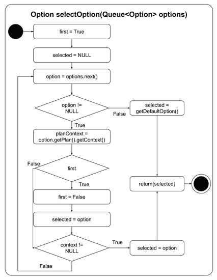 Ideally, the selected option should be the most applicable or most specific plan. In practice, making this determination can be difficult. Is the most specific plan the one with the most terms in the context? Perhaps yes, however it may not always be the case. That said, one must wonder, how often are there multiple applicable plans for the highest priority event? In examining the contexts of the plans in the Agent in a Box, it was noted that there were generally no more than two options available to the option selection function, one of which was a default plan. This observation provides a simple means for selecting the most appropriate option: a default plan should not be selected if a non-default plan is available. The implementation of the option selection function is illustrated in Figure 6. This function iterates through the options and checks the length of the plan context. If the context is not null, the plan is not a default plan, and the option is selected. Otherwise, the next plan is checked. If the only available plan is a the default plan, this option is selected.