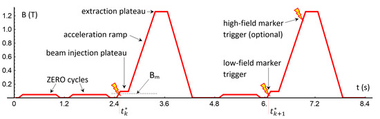 where i is the running index of the waveform samples; is a pre-defined gating window, typically 20 long, that prevents spurious triggers to happen too far from the expected time during a cycle; is the time derivative of the sensor output, calculated with a seven-point finite-difference scheme; and represents a voltage threshold, set independently for each system above the residual noise level after filtering. As the zero-crossing can happen anywhere within the interval, this simple algorithm has an uncertainty of , which is negligible. We recall that all the algorithm’s parameters are stored in FPGA registers loaded at run time by the FESA software, which can be adapted automatically to the type of cycle being run via the PPM mechanism.