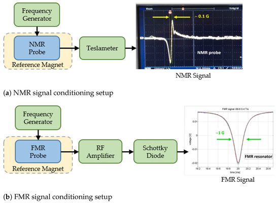 Figure 4 depicts the setup of the two field markers, along with their conditioners and typical examples of output signals. The NMR probe output is demodulated in the teslameter unit, whereas the FMR resonance signal is first amplified and then amplitude-demodulated with a Schottky diode.