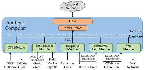 The core of the FIRESTORM system is the FEC, shown in Figure 6, an industrial diskless rack-mounted PC hosting the main electronic components [29]. About 2000 FECs are deployed throughout CERN for interfacing with devices that are involved in synchrotron control, such as RF and vacuum control systems, beam diagnostics instrumentation as well as the B-train systems. The current generation of FEC is the Siemens SIMATIC IPC847E with up to 11 free PCIe slots. The operating system is 64-bit CentOS7 Linux [30], and the software is based on a distributed, real-time C++ class framework called Front End Software Architecture (FESA), which is at the heart of accelerator controls at CERN and GSI [31]. FESA abstracts the interface between the high-level accelerator control infrastructure and the local hardware, which is accessed via user-written device drivers. Tools are provided to help with the generation and debugging of C++ code. Automatic mechanisms are provided to store and retrieve class properties representing configuration parameters from a common database, as well as broadcasting measurement and diagnostic data vectors across the complex in quasi-real-time, i.e., with a latency of the order of a full magnetic cycle, which is adequate for many non-critical tasks. All communication happens on the Technical Network, a segregated Ethernet network secured against intrusion that is used to control and monitor all accelerator systems.