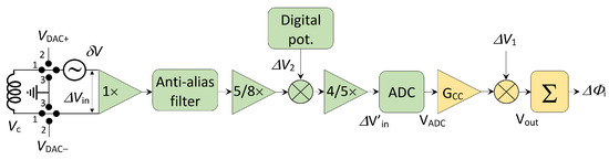 where is the internal gain correction factor, and represents the coarse offset correction. To remain within the FPGA resource limits with a reasonable margin, all variables in Equation (8) are represented in 18-bits, with an effective resolution of . The change in magnetic flux is integrated according to: