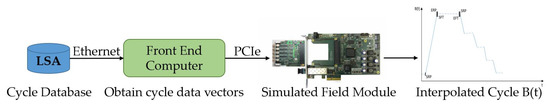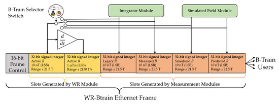 The key functions of the FIRESTORM B-train are implemented by a set of modules based upon off-the-shelf PCIe FPGA carrier cards (Simple PCI Express Carrier, or SPEC) hosted in an industrial Front End Computer (FEC). Each SPEC card hosts a custom-made FPGA Mezzanine Card (FMC) that implements analogue and digital I/O. This architecture allows splitting out the different functions with a fine level of granularity, improving both the flexibility and the maintainability of the final system. All design elements, including PCB layouts and firmware, are released on the Open Hardware Repository (OHWR) [26], a CERN initiative aimed primarily at the High Energy Physics community to stimulate collaboration, as well as the commercialization of the designs by industrial partners. These cards are linked to the magnetic sensors through the B-train crate, acting as a central hub. The final design element is a fibre-optic Ethernet-based network called White Rabbit (WR) [27], which is used to distribute the measured field with high speed and noise immunity [28]. The use of an Ethernet frame allows for the transmission of the measured magnetic field alongside various ancillary signals, metadata and, crucially, three other versions of the field itself. These are: the field measured by the legacy system, where available; a copy of the nominal field obtained from the magnetic cycle database (simulated field, see Section 4.4); and a mathematical model of the field based on the magnet excitation current (predicted field, see Section 4.5. This is currently only at the prototype stage and is not implemented in the deployed systems). Access to these high-resolution, synchronized versions of the magnetic field is expected to greatly facilitate system diagnostics and to enhance operational flexibility in certain situations, e.g., when the measured field is not the most appropriate feedback source for the users (see Section 4.4).