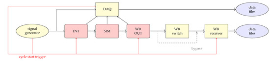 The amplitude transfer function and the latency of the whole acquisition chain were measured on a the test setup represented schematically in Figure 18, including: a signal generator, a complete FEC with Integrator, Simulated Field and WR output modules, an external WR switch (simulating the distribution network) and a WR receiver (simulating an end user). In the following subsection, the two tests are described in detail.