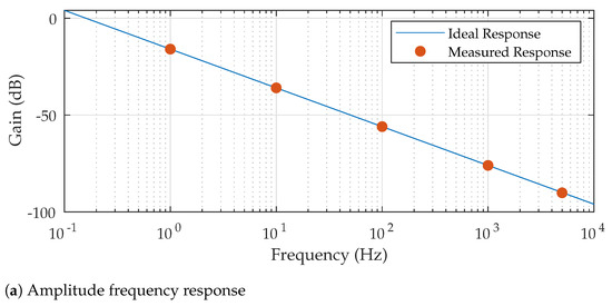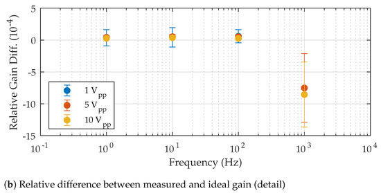 The gain response was measured as a function of frequency by injecting into the integrator for 1 sine waves of varying amplitudes, i.e., 1, 5 and 10 pp, and then retrieving the waveform from the White Rabbit stream at the receiver’s end. For this test, the receiver used was a diagnostic system called a “WR Sniffer” [51], which is able to continuously stream multiple WR channels to disk at a peak aggregated rate of about 100 kfps. This entails an uncertainty of on any individual timing measurement, which can, however, be improved by averaging over a sufficiently high number of repetitions. The peak-to-peak amplitude of the response was then derived as the mean difference between successive maxima and minima, thereby cancelling out the effect of integrator drift. The amplitude response ratio is shown in Figure 19a along with the dB/decade slope of an ideal integrator, while the difference between the two is magnified in Figure 19b. Below 100 , mean errors are within the target tolerance of 100 ppm; whereas, starting from 1 , the effect of the anti-aliasing filters starts to manifest, and the error increases by several hundred ppm. For frequencies below 100 , the scatter of the results, about , is comparable to the errors measured during the DC tests. At 1 , the scatter is about one order of magnitude higher, which could be ascribed to the decreasing number of samples per period.