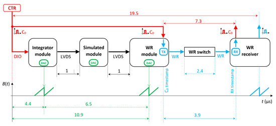 - The details of the propagation through the FEC were measured by a different method based on generating an analog output image of the integrated field via the DAC built in the FMCs of the Integrator, the Simulated Field and the WR modules. (Since the Simulated Field module is by far the least computationally intensive of the three, its latency is very low, and the relative results were unstable, which is the reason why they are not reported here). The mean delays in the Integrator alone and in the whole chain up to the WR module are and , respectively, with a single-take uncertainty of 1 due to the sampling rate of the DAC.