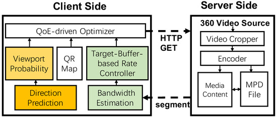Existing 360° video streaming systems mainly focus on optimizing specific quality-of-experience (QoE) goals through fixed heuristics [54,109]. However, users may have different preferences for QoE goals, and thus methods designed for specific scenarios cannot provide high QoE for all users. In addition, most existing methods rely on accurate predictions of future bandwidth and viewpoints, while dynamic changes in real scenarios significantly degrade the performance of these methods. A 360° video viewport adaptive system driven by tile-based viewport QoE optimization is introduced by Xie et al. [54]. Figure 2 shows the architecture of the system. On the server side, a 360° video is cropped by the video cropper with the encoder to generate an MPD document and stored on an HTTP server. A 360ProbDASH service is provided to the client. On the client side, we integrated additional modules in the DASH adaptation algorithm. (1) Direction Prediction: predicts the direction of user head movement; (2) Bandwidth Estimation: estimates the corresponding time-varying throughput on the basis of download duration; (3) QR Map: generates quality-rate (QR) maps for all segments on the basis of attributes in the MPD; (4) Viewport Probability model: calculates the viewing probability of each tile with reference to the user’s directional prediction error; (5) Target-buffer-based Rate Controller: controls the buffer to stay at the target level; (6) QoE-driven Optimizer: determines the optimal download segment involved in an HTTP GET request based on information from Modules 3–5. The system minimizes the expected spatial variation of quality distortion bricks and quality as the QoE optimization objectives under the constraint of the total transmitted bit rate. Experimental results showed that the method exhibited better results under the evaluation of some target metrics.