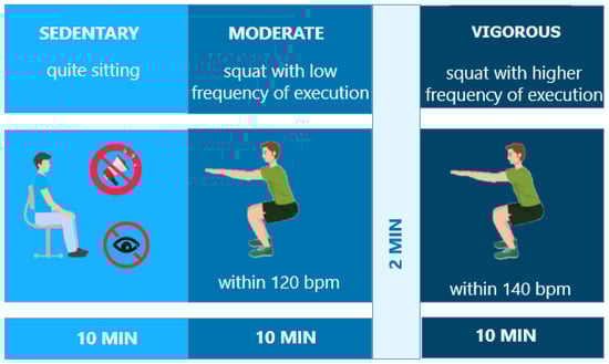 Considering similar studies in the literature, involving free body exercises [23,32,33], a specific test protocol was designed for this study. Participants were involved into two tests per day, in the morning and in the afternoon always at the same hour, for 5 consecutive days, resulting in a total of ten test sessions. Each session included three PA conditions with different intensity levels (10 min for each—see Figure 2): the first test included a sitting condition, the second a squatting period, and then the third a squatting with a high frequency of execution. At the end of moderate activity, two minutes of rest were included in the acquisition protocol to ensure the vital signs could return to the physiological baseline. The overall session lasted about 32 min.