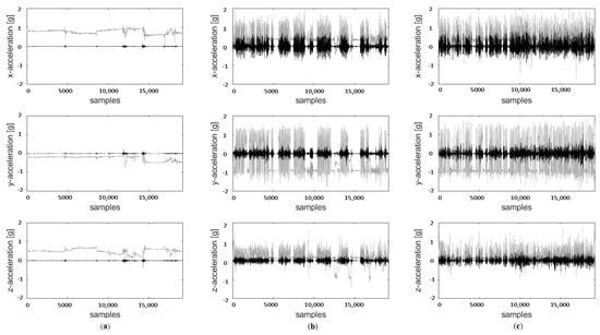 Raw (light grey) and filtered (black) acceleration signals in the three spatial directions and for three different levels of physical activity exertion: (a) sedentary, (b) moderate, and (c) vigorous.