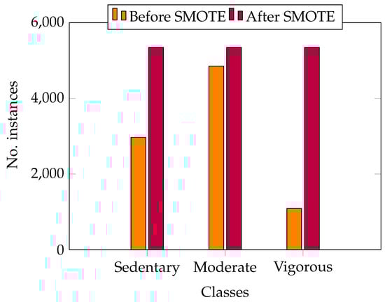 In order to classify the PA intensities, each time window was labelled as a 0 (Sedentary), 1 (Moderate) or 2 (Vigorous) class activity, according to the participant’s effort perceived expressed by filling the Borg RPE scale. After labelling the instances, the classes activity showed a different number of samples (i.e., 2970 for Sedentary, 4851 for Moderate and 1089 for Vigorous), thus, resulting in an unbalanced dataset. This imbalance does not satisfy the balanced endpoint hypothesis of most machine learning-based prediction models. Therefore, the Synthetic Minority Over-Sampling Technique (SMOTE) was used to re-sample the classes by adding synthetic data, as described in the Section 2.4.1.