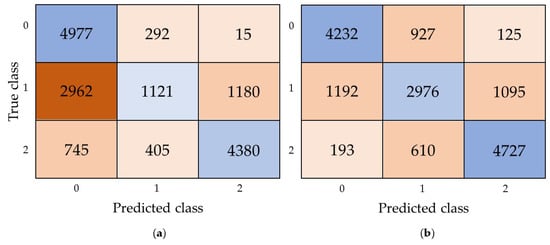 Figure 5a,b show the confusion matrices obtained using the SVM classifier and BT classifier on both physiological and acceleration data, respectively. As mentioned before, there are three classes to be recognised: 0, 1, and 2 related to sedentary, moderate, and vigorous activity, respectively. The blue cells (i.e., principal diagonal) indicate the positive class that is correctly identified, i.e., the number of instances that have obtained a predicted class equal to the true class. The bluer the colour, the more correct the obtained previsions. The cells in a range of pink identify the prediction errors, and they are represented by values outside the diagonal.