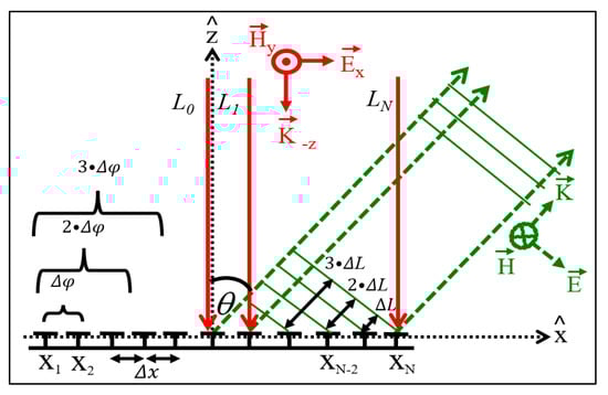 Figure 2 shows a scheme of radiation steering using an MS reflector, where L1, L2, and LN are incident rays toward the surface marked in red arrows. The optical path difference (OPD) between the reflected rays from unit cells Xj to Xj+1 is defined as ΔL and is described in Equation (6):