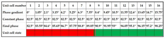 As shown in Figure 4, the eight unit cells on the left are defined as phase state ‘1,’ and the eight unit cells on the right are defined as phase state ‘2.’ A change in the constant phase value leads to a change in the unit cells states for the same planed phase gradient; therefore, there is no single-valued par unit cell state for a given phase gradient. This inherent resolution difficulty of the digital coding of an MS reflector can be solved using unit cells, which provide a continuous reflection phase. The phase gradient is applied directly to the unit cells, as shown in Figure 4, line 2.