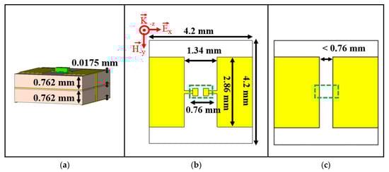 Unit cell design: (a) unit cell side view, (b) unit cell front side, and (c) standard patch unit cell design.