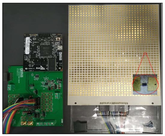The stimulation voltages V1 to V16 to the varactors in each even column were supplied by an inexpensive programmable DAC model AD5766 from Analog Devices, shown in the left part of Figure 7. This DAC has 16 channels with a 12-bit resolution and a dynamic range of 0 to 16 V. The use of a varactor as a tuning method enabled very high capacitance resolution. However, there was a practical limitation on the reflection phase resolution due to the DAC resolution, which was ΔDC = 3.9 mV.