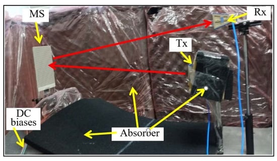 Figure 9 shows the measurement setup with the arrangement of the antennas and the MS prototype. The Tx’s vertical height was lowered and tilted relative to the MS center. The Rx’s vertical height was raised and tilted relative to the MS center to avoid radiation blockage between the Tx and the Rx.
