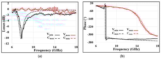 The MS columns were uniformly set with DC voltage or capacitance values for extracted unit cell reflection properties. The unit cell reflection simulation results for the max and min capacitance values compared to the measurement results for 0 V and 16 V reverse bias voltages are shown in Figure 10.