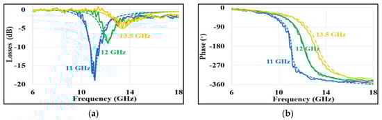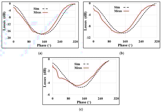 Since the relation between the varactor reverse bias to the Cd value is not linear, the agreement between the simulation and measurement results in the context of losses is not shown directly from the results curves in Figure 13. Therefore, using post-processing, the measurements and simulations losses as a function of the reflection phase for all operating frequencies were calculated and are shown in Figure 14.