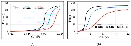 For higher-frequency operations, the calibration curve became moderated with fewer losses at the expense of decreasing the dynamic phase range, as shown in Figure 12 and Figure 13. Furthermore, for 11 GHz, most of the dynamic capacitance range was acquired in lower absolute values of the DC reverse bias and for 13.5 GHz in higher absolute values. According to the varactor datasheet, about 75% of the total Cd range is enabled for the DC reverse bias range of 0 to 4 V, and the rest obtain for the 4 to 15 V [42]. Thus, additional moderating in the calibration curves as a function of DC reverse bias will lead to higher steering angle resolution for a high operating frequency.