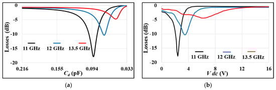 The measurement and simulation results of the reflected magnitude, as a function of the varactor capacitance Cd and V dc values, respectively, for three operating frequencies, are shown in Figure 13.