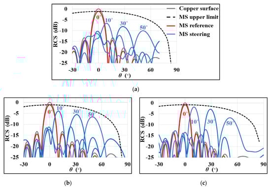 In Figure 15, for each frequency RCS results set, the black dashed curve is the theoretical upper limit of the steering ability of the relevant frequency. This upper limit is proportional to cos(θ) [38] and was extracted from the unit cell properties via CST using the active element impedance method [39]. The result for the copper surface in the same MS size for reference purposes is in the grey curves, and the result for the MS without phase manipulation is in the red curve when both RCS peaks were at angle θ = 0°. The MS beam steering results for several θ angle values, as an example, are in the blue curves. For a planar square reflector, the far-field pattern is proportional to the sinc function. The sinc profile is narrow for a wide size surface and wide for a narrow surface [47]. In this case, the MS reflector size was constant and the wavelengths for each frequency were different; therefore, the profile of the main lobe at 13.5 GHz was narrower than the 11 GHz main lobe, but it depended on the array size rather than an inherent issue.