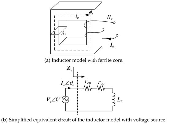 A function generator to provide a high-frequency voltage source Ve is used, as shown in Figure 1b. Depending on the electrical and magnetic characteristics of the inductor model, test current Ie and phase difference between the voltage and current θe are different as follows: