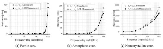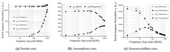Based on the measurement results of Ve, Ie, and θe in (4) by a function generator (KEYSIGHT 33522A) and an oscilloscope (Lecroy 104Xi-A oscilloscope), the inductance and resistance in (5) w.r.t. operating frequency can be calculated, as shown in Figure 3 and Figure 4, where LCR measurement results have been obtained by a KEYSIGHT network analyzer E5071C. In case of LCR measurement used in this paper, uncertainty below a 10 MHz frequency range is highly less than 0.1(dB) [17,18]. A little discrepancy between calculation and LCR measurement, i.e., lower than 8%, comes from leakage magnetic flux, which is leaking out to the air, not circulating through the test prototypes of the magnetic materials in Figure 2. Because the proposed idea to calculate the inductance and resistance in (1)–(5) is assumed to be ideal inductor having no leakage magnetic flux, this inherent leakage magnetic component is not reflected to the calculated results of Figure 3 and Figure 4. Unfortunately, this leakage component cannot be analytically modeled due to the unpredictable radiation of the magnetic field and the non-linear property of the ferrite core [3]. This leakage magnetic flux could be minimized if a manufactured piece of the magnetic core in Figure 2 is small enough so that the generated magnetic flux from the test currents is all passing through the magnetic cores, not leaking to the air. Because the manufactured pieces of the magnetic cores in Figure 2 are the commercialized products in markets, and the size of magnetic pieces are already fixed, this small discrepancy is inevitable in this case. Nevertheless, the confirmation of the tendency for the permeability w.r.t. operating frequency is highly similar, and the relative comparison w.r.t. operating frequency can be obtained by the proposed idea. The real permeability of the ferrite core increases w.r.t. frequency, whereas that of the amorphous core and nanocrystalline core decreases. The imaginary permeability always increases for three core cases due to the increment of the core loss, which is usually proportional to the operating frequency.
