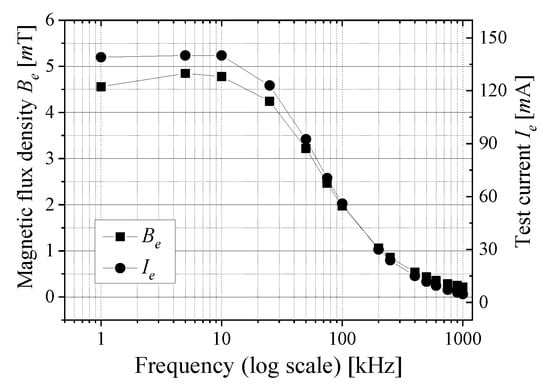 From the results of Figure 3 and Figure 4, the real and imaginary permeability can be found, as shown in Figure 5. In case of the PM11 ferrite core, the calculated results of the real and imaginary permeability w.r.t. frequency are shown in Figure 5a. The values of real and imaginary permeability for fs > 250 kHz, which were already described in the datasheet [15], are matched well with the calculation and measurement results. According to the datasheet [15], unfortunately, the information for the imaginary permeability has not been revealed for the fs < 250 kHz range. From the matching tendency between datasheet and calculation results, it can be said that the values of real and imaginary permeability for fs < 250 kHz is reliable. Although the magnetic characteristic of the amorphous core is not revealed, the real and imaginary permeability can be found by the proposed methodology, as shown in Figure 5b. In case of the nanocrystalline core, the calculation results are also in good agreement with the datasheet that has described only the tendency of the permeability w.r.t. the operating frequency [16]; hence, the numerical values for the permeability can be specified. The test current level Ie and the calculated magnetic flux density inside the ferrite core Be w.r.t. the operating frequency is shown in Figure 6. The magnetic field inside the magnetic cores Be can be calculated from (2), and the cases of amorphous core and nanocrystalline core are omitted due to the same tendency of Figure 6. It is noteworthy that the test currents and magnetic flux density can be increased until Be < Bsat ≈ 0.3 T by the other AC power supply devices, so that the exact complex permeability can be obtained under rated operating condition, although the function generator, which can provide a convenient frequency modulation function, has been used in this paper.