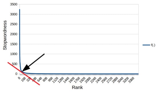 As to the choice of the cutpoint for the list of candidate stopwords, we propose a geometric strategy, formally described in Algorithm 2 and graphically shown in Figure 1, where the x axis reports the term ranking positions for terms ordered by decreasing stopwordness according to the f function, and the y axis reports the stopwordness values. First, all different values of the stopwordness function for the terms in the corpus are considered, ordered by decreasing value, and plotted on a Cartesian space where the x-axis is associated to the set of different frequencies and the y-axis reports the actual frequencies (plot in Figure 1). Considering only different values avoids plateaus, yielding a monotonically decreasing plot and a more compact x-axis, especially on its trailing part. The resulting diagram has an irregular hyperbole-like shape, on which the cut point is determined geometrically as follows. Consider a line of given (decreasing) slope a, and height b on the origin of the Cartesian space such that it is tangent to the plot. Then, the y coordinate of the tangency point will be our cutpoint frequency. So, our procedure takes the slope parameter a as the only input. Acting on a, one may obtain a stricter or looser selection: the more the slope, the earlier the cutpoint; the less the slope, the later the cutpoint. Of course, being the plot on the positive quadrant, we will consider negative slopes. Since the boundaries of the plot depend on the number of words in the vocabulary (x-axis) and on the maximum word frequency in the corpus (y-axis), the same line slope will have different effects depending on such boundaries. To reduce the effect of this issue, we propose to normalize the axes ranges, so that the plot becomes square. This has a nice side-effect on the understandability of the slope setting. Indeed, parameter corresponds to a slope, which should identify the cutpoint in which the plot slope changes from vertical to horizontal. So, values [−1, 0] will select the cutpoint on the right-hand side of the elbow, while will select the cutpoint on the left-hand side of the elbow.