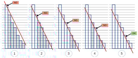 The procedure is shown in Figure 2 for a sample bar diagram, where the steps are denoted by numbers in circles. The axes in Figure 2 and Figure 3 were not labeled because they describe our cutpoint assessment approach in general, for any monotonically decreasing histogram, independent of its interpretation—stopwordness ranking or other (in this work, they are to be interpreted as in Figure 1). The bars were enlarged for the sake of readability, so that their points become squares; let us consider the centroid of each square as point represented by the square. Circled numbers below the diagrams denote the various steps of the procedure, and, for each step, an arrow shows the candidate cutpoint. Bars whose top point falls below the line are filled with gray in the picture. (1) We start with the first bar, and draw the line passing from its top point (centroid of the top square); we start scanning the subsequent bar tops and see that the second bar top is already below the line. (2) So, the second bar top becomes our new candidate; the line passing from it is drawn, and scanning of subsequent bar tops starts; again, the next (third) bar top is below the line. (3) The line passing from the third bar top is drawn, and scanning starts: the next (fourth) bar top is above the line, so it is skipped, while the fifth bar top is below the line. So, step (4) is not carried out and our new candidate becomes the fifth bar top. (5) The line passing from the fifth bar top is drawn, and scanning starts: all subsequent (sixth and seventh) bars are above the line, and then the bar diagram ends. So, the selected cutpoint corresponds to the height of the fifth bar.