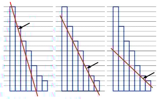 It can be found by analyzing, in turn, each i, computing the corresponding b, and checking that the bar top of all other i’s is above the line, i.e., . Operationally, we proceed for increasing i’s, starting from . For each i under consideration we scan the subsequent bar tops, and skip them while they are above the line. If we reach the end of the plot, then the current i provides the cutpoint frequency; otherwise, as soon as we find a bar whose top is below the line, the corresponding position becomes our current candidate i, and we go back to the skipping step. In practice, instead of normalizing the axes, we report the normalization on the slope, so as to avoid recomputing all bar values, and also still having all integer values. Consider slope for the case of equal x and y ranges. With different x and y ranges, say and , respectively, the unitary increase of x corresponds to a increase of y; thus, the normalized slope to be used in practice is .