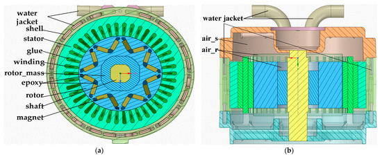 The analyzed motor is mainly divided into 12 parts. The specific structure and relative position relationship are shown in Figure 1. The coolant flow area, called the water jacket, includes the combined inlet pipe, outlet pipe, and jacket, which are regarded as a whole, called a water jacket. The other parts are the shell, stator, insulation filler glue, winding, rotor_mass, epoxy, rotor shaft, and magnet. Glue and epoxy are the substances that are filled around the windings and permanent magnets, respectively. The rotor_mass is the connecting part between the rotor and shaft. The air_gap region inside the motor is divided into two parts in the FEM models. One is the stationary region that remains still with the stator, called air_s. The other is a region of rotating air that rotates with the rotor, called air_r.
