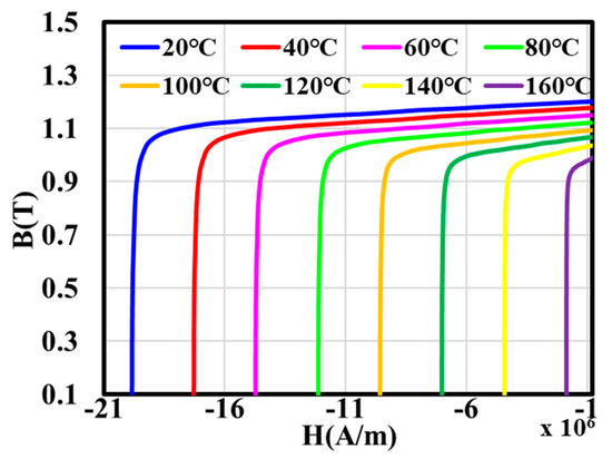 Temperature changes during motor operation will also affect the working characteristics of the PM. The demagnetization law of the PM was tested by a dynamic hysteresis loop tester. The hysteresis loop can be observed and recorded directly by an oscilloscope [30]. As the motor temperature changes, the magnetic change law of the demagnetization curve of the PM used in the motor is shown in Figure 3.