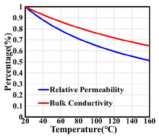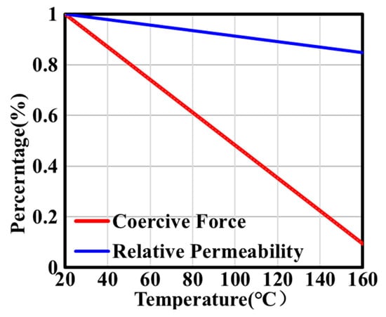 In Figure 4, with the increase in temperature, the relative permeability and the coercivity of the permanent magnet gradually decrease. The parameters are calculated as follows [32]:
