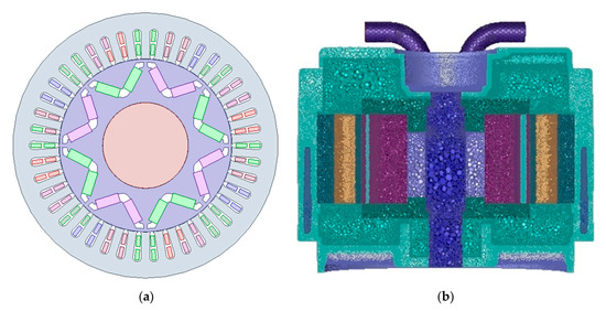 Motor model. (a) Electromagnetic model; (b) cross-sectional mesh.
