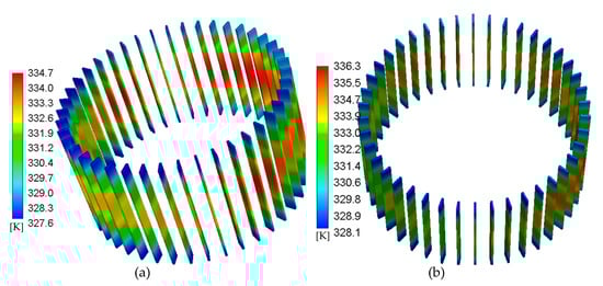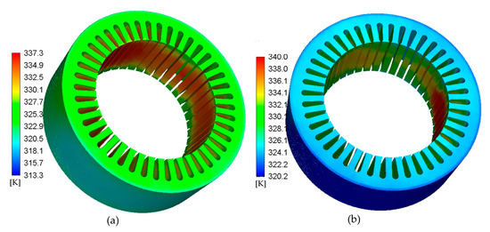Stator temperature distribution. (a) Unidirectional coupling; (b) bidirectional coupling.
