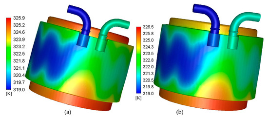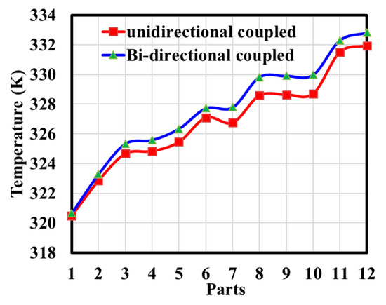 In Figure 9, at the same inlet temperature and flow rate, the coolant temperature also increases. The results show that the temperature of the bidirectional coupling model is about 0.6 °C higher than that of the unidirectional coupling model. Due to design reasons, some locations in the water jacket are blind areas for water flow, so the temperature in these areas is high. The local temperature can be reduced by improving the structure of water jacket.