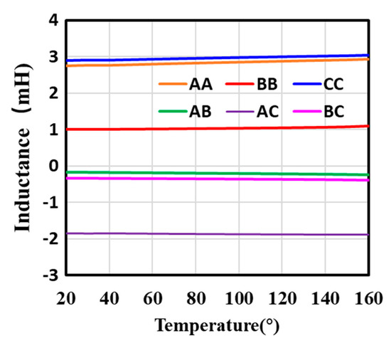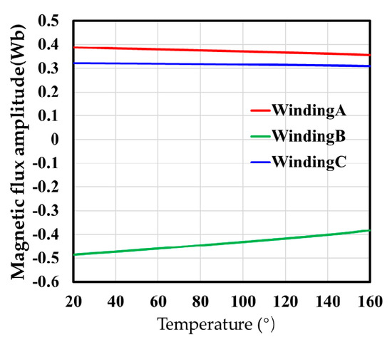 In Figure 11, the self-inductance and mutual inductance of the windings change with the temperature. It can be seen from Figure 12 that the flux linkage in Winding A and Winding C is positive, and the size is similar. The flux linkage in Winding B is negative. The currents of Winding A, Winding B, and Winding C are 124.9 A, −211.8 A, and 86.9 A at 20°, respectively. In view of the same operating point, the other temperature points are similar. According to the inductance calculation formula, it can be inferred that the inductance curve in Figure 11 is reasonable. In Figure 11 and Figure 12, as the temperature rises, the amplitude of the winding inductance increases, while the amplitude of the air-gap flux produced by windings decreases. The changes in coil self-inductance and mutual inductance are shown in Table 3.