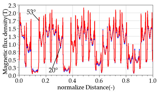 As shown in Figure 16, when the temperature increases from 20° to 53°, the magnetic flux density at the same air gap position decreases. Figure 15 shows the flux density around half the circumference of the center of the air gap. During the operation of the motor, the magnetic flux density in the air gap is generated by the permanent magnet and winding current. When the temperature increases, the air gap magnetic flux produced by the permanent magnet decreases. In order to keep the air gap magnetic flux density constant to maintain the motor output, a larger current is used to generate the magnetic flux density compared to at low temperature. Increasing the current input will increase the copper loss of the motor. Therefore, it is a good choice to reduce motor loss by controlling temperature. By controlling the temperature of the motor, it can also avoid damage to the winding insulation or permanent demagnetization of the permanent magnet, to ensure the power output of the motor.