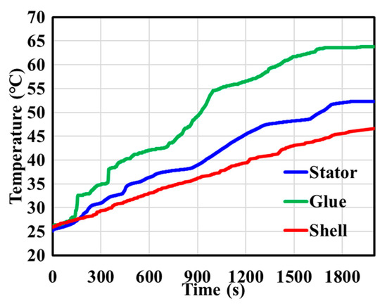 Three temperature sensors were installed on the shell, stator, and glue. The results of temperature testing at the three parts by using the test instrument produced by environmental and technology application services (ETAS) and the supporting software integrated calibration and acquisition system (INCA) under the rated motor conditions are shown in Figure 19. ETAS is a wholly owned subsidiary of Bosch group. There are many main products, but here, the main application is its temperature test module. The preliminary work of the project only focuses on the rated working condition of the motor. Due to the needs of the project, the in-depth study of the motor will continue. The results of the simulation and test are listed in Table 4.
