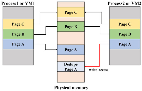 A memory deduplication attack [11,15,16] is a type of memory disclosure attack that allows an attacker to infer the content in the victim’s memory. This attack exploits a Copy-on-Write (CoW) mechanism employed in hypervisors, such as KVM and VMWare ESXi, to enable memory deduplication (Figure 2). That is, to achieve memory saving, the hypervisor repeatedly looks for identical memory pages and merges them into a single page. The merged page is set to read-only, such that when a write occurs to the page, it is then duplicated back into separate pages. This may provide timing information to an attacker. Specifically, the attacker is able to infer whether the target page has been merged by observing the write latency. A memory deduplication attack leverages this timing information to infer the content of the target page.